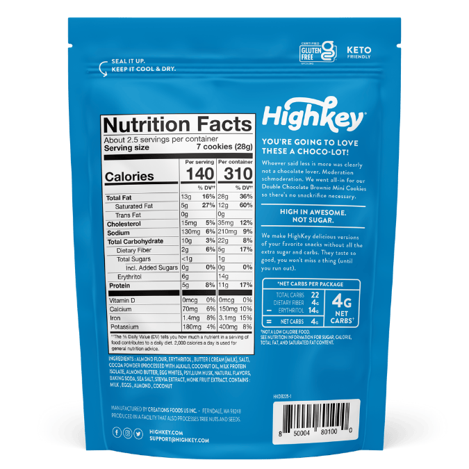 The term "net carbs" simply means carbs that will be absorbed by the body. Since fiber and certain sugar alcohols, like the erythritol we use, are not digestible by the body, we subtract dietary fiber, erythritol, allulose, and glycerin from the total carb count. For example, our Chocolate Chip Mini Cookies have 11 grams of total carbs. However, once you subtract 2g of dietary fiber and 7g of Erythritol, your body only digests 2g of net carbs per serving.