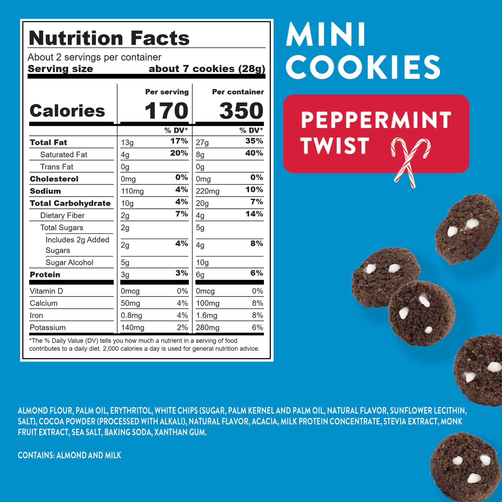 Almond Flour, Palm Oil, Erythritol, White Chips (Sugar, Palm Kernel and Palm Oil, Natural Flavor, Sunflower Lecithin, Salt), Cocoa Powder (processed with alkali), Natural Flavor, Acacia, Milk Protein Concentrate, Stevia Extract, Monk Fruit Extract, Sea Salt, Baking Soda, Xanthan Gum.